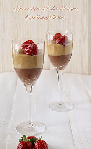 - Serve by putting first the chocolate mousse and then the mocha. Garnish with strawberries. You can cut more strawberries and add them to the chocolate mousse.
