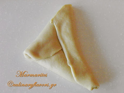 - Ρίξτε 1 κ.σ. τυρί και ενώστε τη ζύμη με τέτοιο τρόπο ώστε να σχηματιστεί ένα τρίγωνο.