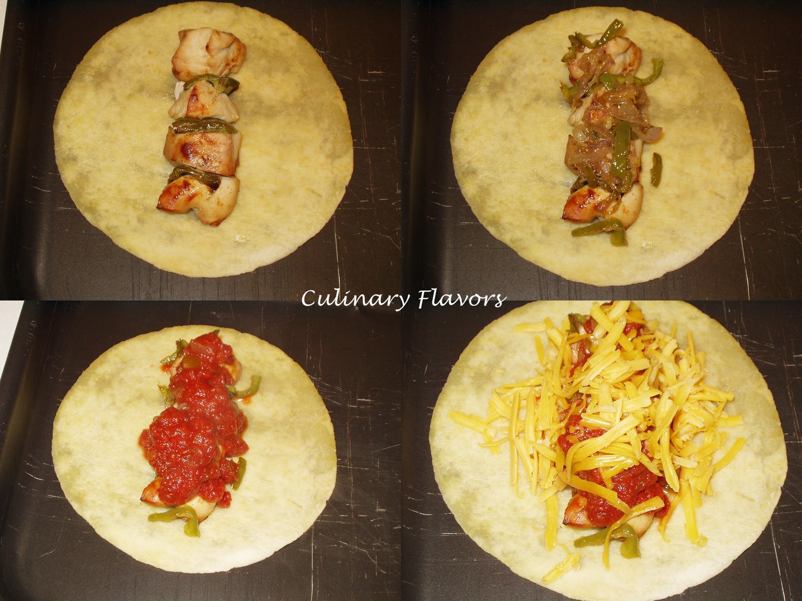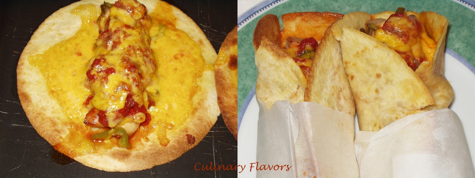 Take the pita or tortilla, place the chicken souvlaki throw couple of tbsp of salsa and sprinkle some cheddar cheese.