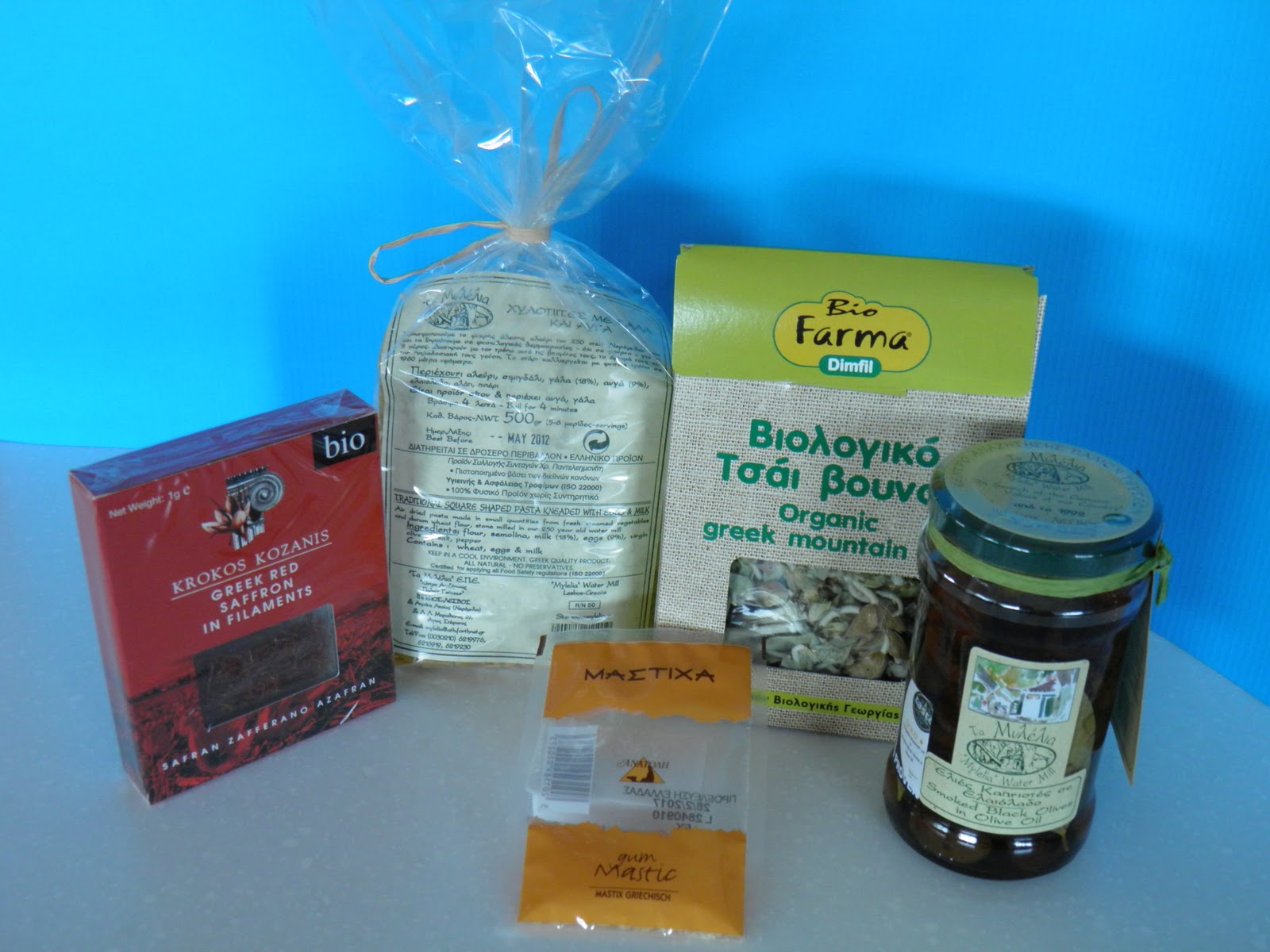Now as I told you in my previous post I will have a giveaway every week until Christmas. For this giveaway I have some Greek products to give to one lucky winner. First we have a package of Milk and Egg Hillopites (Square Shaped Pasta Kneaded with Eggs and Milk), a jar of Smoked Black Olives in Olive oil, a package of Organic Greek Mountain Tea, a package of Krokos Kozanis (Greek Red Saffron in Filaments) and Mastic. These are all traditional Greek flavors I bought for you. The Hillopites and olives come from ‘Mylelia Water Mill’, a company dedicated in preserving traditional produce and methods of making delicatessen goodies. They produce in small quantities trying to preserve Greek tradition and taste. The rest are dear flavors to all Greeks and can be found in Greek grocery stores here.