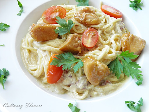 - Σερβίρετε τα ζυμαρικά Alfredo και από πάνω το Jack Daniels κοτόπουλο.