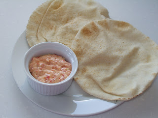 Put the red bell peppers on a blender and mash them to small pieces. In a bowl mix everything along with the red bell peppers and refrigerate for at least an hour. Then put some of the dip in a small bowl and heat in the microwave couple of Arabic pitas and dig into that.
