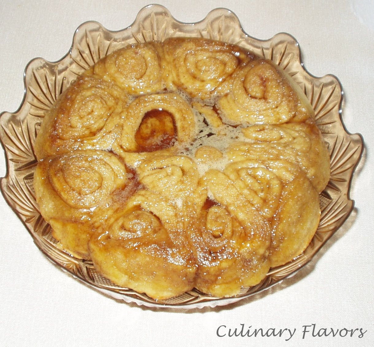 Lay the buns in the prepared pan. Bake them in a preheated oven for 23 to 25 minutes or until golden brown. Topping should bubble around the edges. Immediately invert the pan onto a serving plate. Let the buns sit for 15 seconds and then remove the pan. Scrap any left syrup on the pan and put it on top of the buns. Serve them warm.