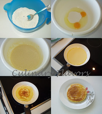 Shift the flour with the baking powder in a bowl. In another bowl mix the eggs and sugar and whisk until they become fluffy. Add the rest of the liquids and whisk again. Put the dry ingredients into the bowl with the liquids and mix until they are incorporated. In small skillet 15cm. add 1 tbsp of margarine and put it in medium-high heat. Add approximately ½ cup of the batter and let it bake until golden, turn on the other side and do the same. Follow this procedure until the batter is finished. Add honey and cinnamon and serve warm.